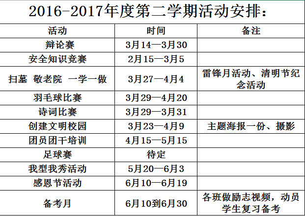 为丰富大家的课余生活,营造积极向上、朝气蓬勃的校园氛围,建筑与材料学院特将本学期活动安排公布如下: