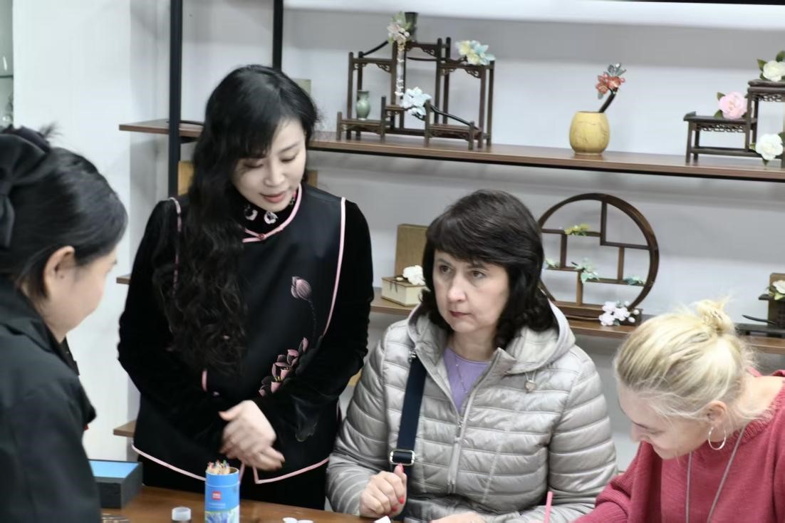 俄罗斯访团成员对素采创研工坊展现出的浓厚文化氛围和精湛技艺表示出浓厚的兴趣。她们仔细聆听介绍,不时驻足欣赏工坊内陈列的各类手工艺作品,对作品的创意设计、制作工艺以及所蕴含的文化内涵赞不绝口。